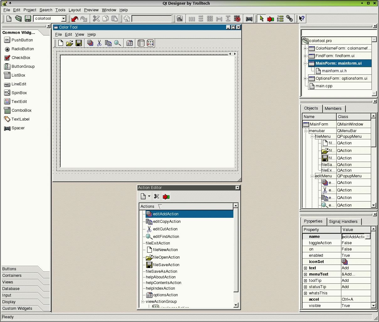This version of TQt Designer has a great deal more functionality than its predecessor. For example, the code for custom slots can be edited directly in TQt Designer; main windows with actions, toolbars and menus can be created; layouts that incorporate splitters can be used; and plugins allow you to package any number of custom widgets and make them available to TQt Designer. Many other enhancements have been incorporated, from small improvements in the user interface to improved efficiency, for example the ability to share pixmaps across all the forms in an application.