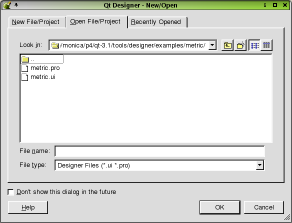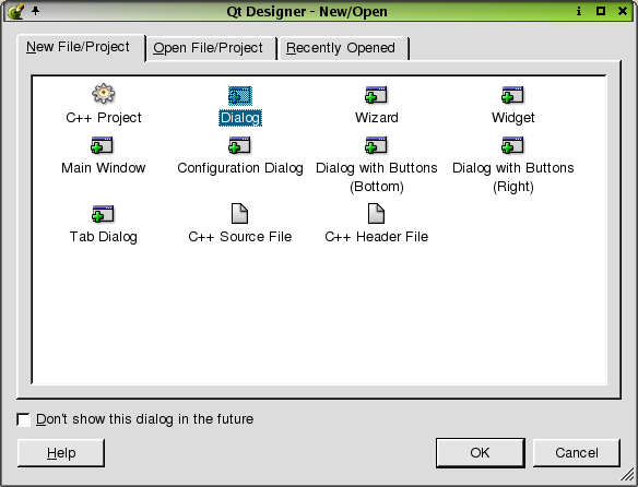 Start up TQt Designer to invoke the TQt Designer New/Open dialog. This dialog contains three tabs to use depending on what you want to do once you start up TQt Designer.