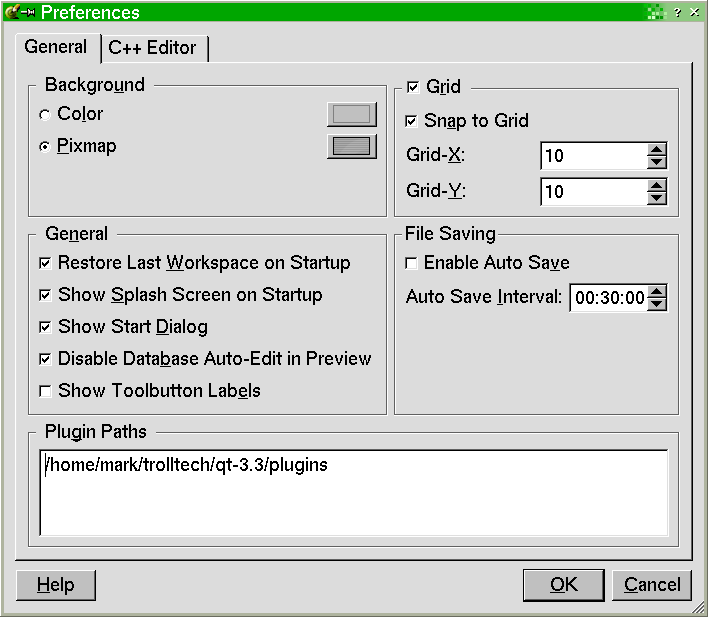 The 'Grid' section has options for customizing the grid on the form. The 'Show Grid' checkbox located above the 'Grid' section is checked by default. Developers using TQt Designer almost always use TQt's layouts to design their forms and rarely make any use of the grid. The grid is provided for the rare occasions when a form is created using widgets with fixed sizes and positions. When 'Show Grid' is checked, you can customize the grid's appearance. When it is unchecked, the 'Grid' section is disabled. The 'Snap to Grid' checkbox is also checked by default. When it is checked, widgets are placed on a dot (snap to the grid) using the X|Y resolution. When it is unchecked, the 'Grid-X' and 'Grid-Y' spin boxes are disabled. Click the 'Grid X' and 'Grid Y' spinboxes to customize the grid settings for all forms.
