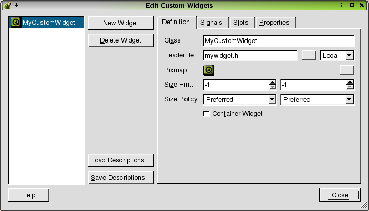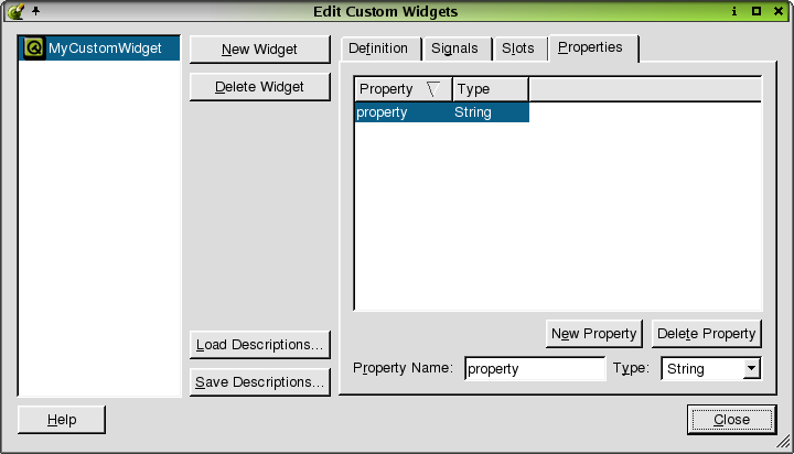 Click the Properties tab to view the list of properties for the selected widget. Click the 'Property' or 'Type' column headers to sort the properties in the listbox. To add a property, click the New Property button. Click the 'Property Name' line edit if you want to change the default name of the property. Note that properties must be implemented in the class using the property system of TQt. To choose a property type, click the 'Type' combobox. To delete a property from the listbox, click the property and then click the Delete Property button.