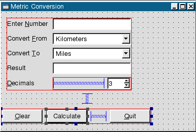 Click the Spacer button again. Click to the right of the Calculate push button, drag right towards the Quit push button, then release.