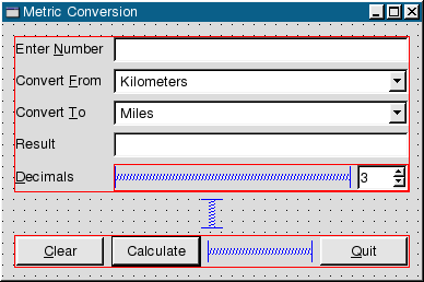 We need to connect three buttons: the Clear button, the Calculate button, and the Quit button. We also need to connect some of the other widgets. For convenience, we can make all of our connections at once using the View and Edit Connections dialog.