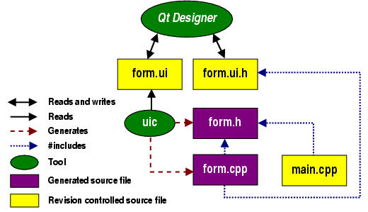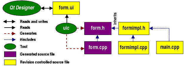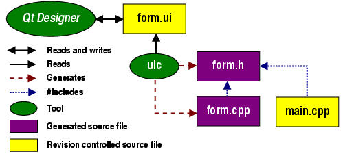 TQt Designer reads and writes .ui files, e.g. form.ui. The user interface compiler, tquic, creates both a header file, e.g. form.h, and an implementation file, e.g. form.cpp, from the .ui file. The application code in main.cpp #includes form.h. Typically main.cpp is used to instantiate the TQApplication object and start off the event loop.