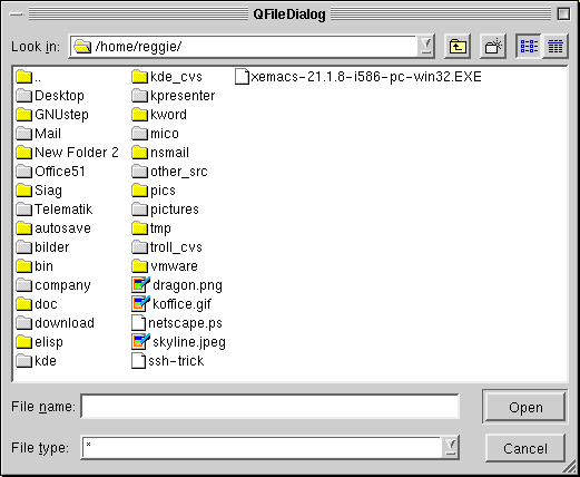 In the above example, the filter is set to "Images (*.png *.xpm *.jpg)", this means that only files with the extension png, xpm or jpg will be shown in the TQFileDialog. You can apply several filters by using setFilters() and add additional filters with addFilter(). Use setSelectedFilter() to select one of the filters you've given as the file dialog's default filter. Whenever the user changes the filter the filterSelected() signal is emitted.