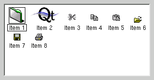 Each item contains a label string, a pixmap or picture (the icon itself) and optionally a sort key. The sort key is used for sorting the items and defaults to the label string. The label string can be displayed below or to the right of the icon (see ItemTextPos).