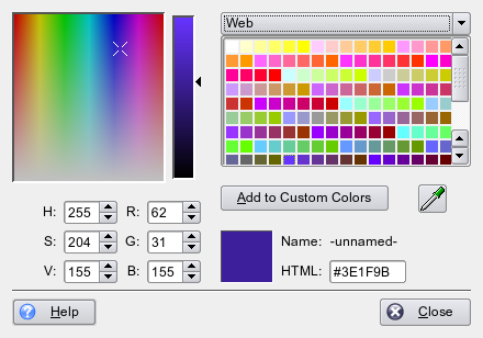 On the right side of the dialog you see a KPaletteTable showing up to 40 colors with a combo box which offers several predefined palettes or a palette configured by the user. The small field showing the currently selected color is a KColorPatch.