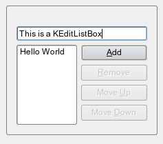 This class provides an editable listbox ;-), this means a listbox which is accompanied by a line edit to enter new items into the listbox and pushbuttons to add and remove items from the listbox and two buttons to move items up and down.