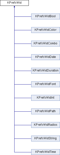 Implemented in KPrefsWidBool, KPrefsWidInt, KPrefsWidTime, KPrefsWidDuration, KPrefsWidDate, KPrefsWidColor, KPrefsWidFont, KPrefsWidRadios, KPrefsWidCombo, KPrefsWidString, and KPrefsWidPath.